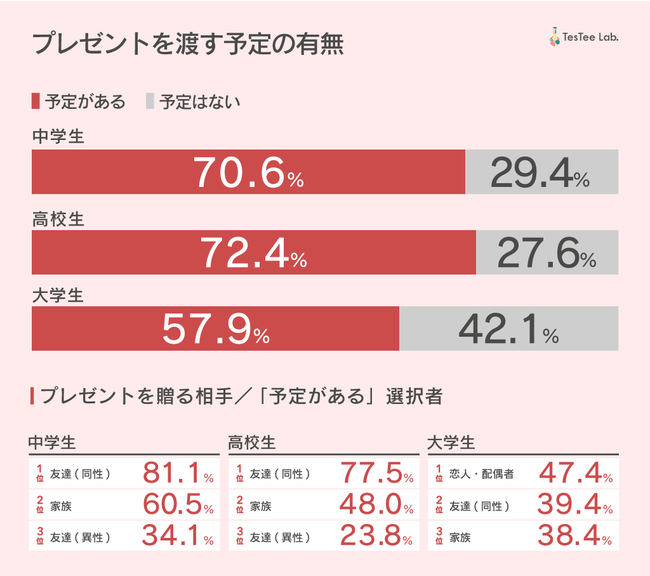 中高生で7割、大学生では約半数が「バレンタインプレゼントを渡す予定がある」と回答