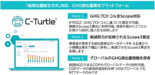 注1: C-Turtleは、削減できるScope3算定を実現するGHG排出量可視化プラットフォームです。一般的に、Scope3の算定は「活動量(企業の活動規模)」×「排出原単位(市場平均値)」で算定されることが多く、企業の削減努力を反映することが難しいという課題があります。C-Turtleは、Scope3の算定に、投融資先やサプライヤーの排出量の実測値(一次データ)を活用し、各社の削減努力を自社排出量に取り込むことができる「総排出量配分方式」を採用しています。これにより、投融資先やサプライヤーの排出量の可視化状況が明確になり、サプライチェーンを通じたGHG排出量の算定・削減の推進が可能となります。