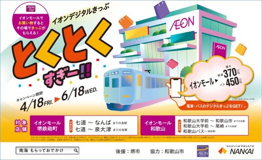 南海電気鉄道株式会社(代表取締役社長:岡嶋 信行、以下「南海電鉄」)とイオンモール株式会社は、2025年4月18日(金)から6月18日(水)まで、イオンモール堺鉄砲町またはイオンモール和歌山において イオンウォレットアプリ内のAEON Payでの決済で3,000円以上のお買い物をしていただいたお客さまに、 デジタルきっぷをプレゼントするキャンペーンを実施します。