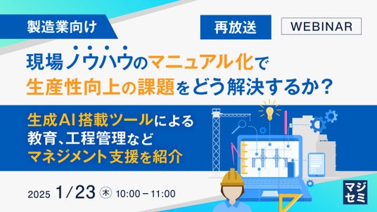 マニュアルトータルソリューションを提供する株式会社テンダ(本社/東京都渋谷区、代表取締役会長/小林 謙、以下「テンダ」)は、2025年1月23日(木)に、「【製造業向け】現場ノウハウのマニュアル化で、生産性向上の課題をどう解決するか? ~生成AI搭載ツールによる、教育、工程管理などマネジメント支援を紹介~」と題し、ウェビナーを開催いたします。こちらは2024年6月28日(金)に開催したウェビナーを、ご好評につき再放送するものです。