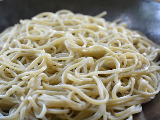 大粒で風味がよい自社栽培の「常陸秋そば」を石臼でゆっくり挽いて、手打ちそばにしました。石臼製粉ならではの豊かな香りが特徴です。新そばの薄緑色となめらかな口当たりをお楽しみください。