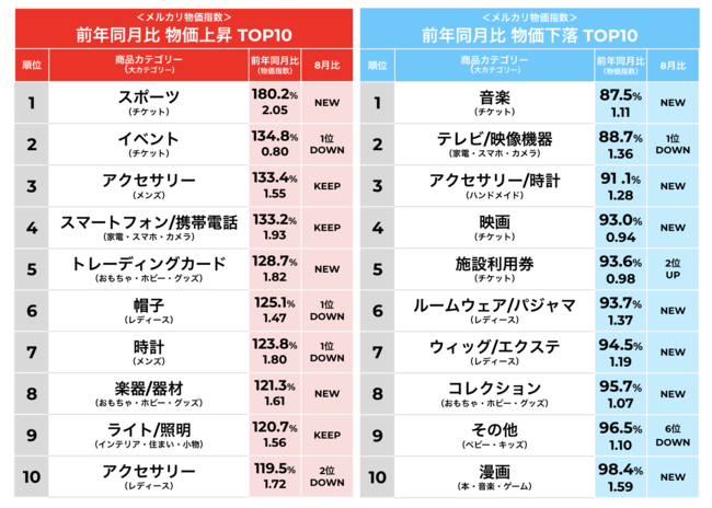 本ニュースレターでは、「メルカリ」の“中カテゴリー”に限定し、前年同月比で物価および数量指数が上昇、または下落した商品カテゴリーを紹介しています。