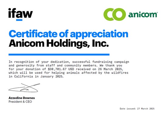 アニコム ホールディングス株式会社(代表取締役 小森 伸昭、以下 当社)は、「ロサンゼルス山火事のどうぶつ救援募金」プロジェクト(2025年1月28日~2月28日、以下 本プロジェクト)を通じて、皆さまからいただいた寄付金と、当社グループからの200万円、また当社グループ社員からの寄付とあわせて、総額4,721,911円を2025年3月25日にIFAW(国際動物福祉基金)へ寄付いたしました。