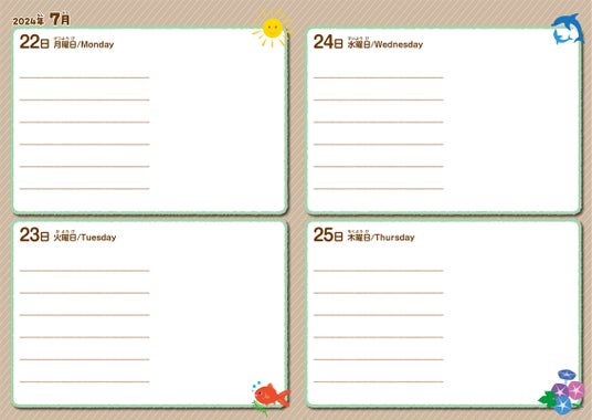 ▼おやこ夏休みてちょう2024 特長・夏休みを規則正しく過ごすための計画をたて自立心を育む、マンスリーカレンダー&ガントチャート
