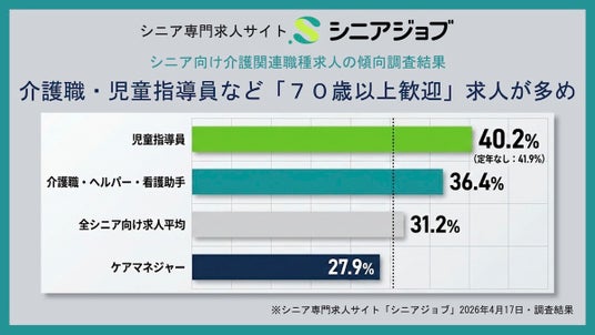 シニア転職支援の株式会社シニアジョブ(本社:東京都新宿区/代表取締役 中島康恵)は、運営するシニア専門求人サイト「シニアジョブ」に掲載された介護職、ケアマネジャー、児童指導員の介護関連職種の求人を調査した結果、「70歳以上歓迎」の求人が児童指導員求人の4割を占めるなど多めであることがわかりました。