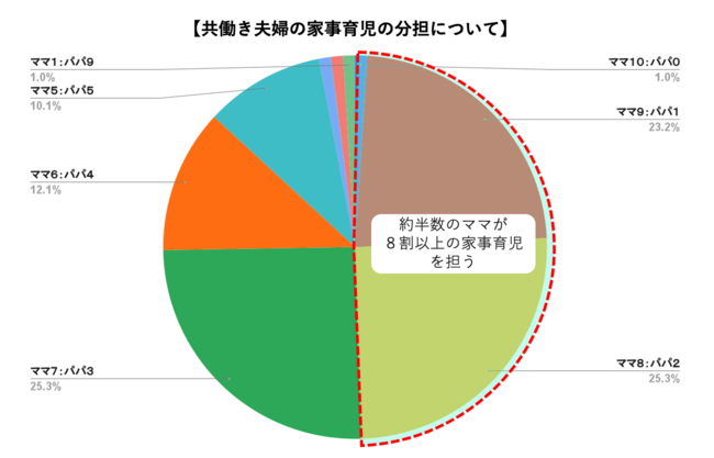 アルバイトなどを含むワーママを対象に、夫婦間の家事育児分担の割合を調査した結果、上位3つには、「ママ8:パパ2」と「ママ7:パパ3」が各25%、「ママ9:パパ1」が23%という結果となり、ママが家事育児を8割以上担う世帯は、約半数(49.5%)を占めました。