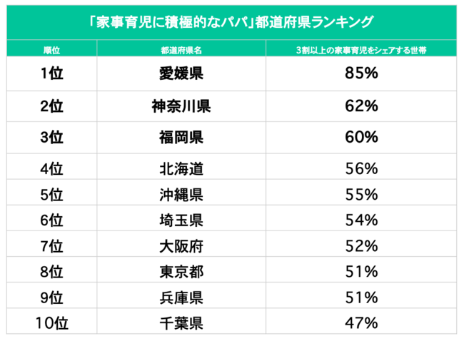 第1位は、3割以上の家事育児を担うパパの割合が85%だった「愛媛県」となり、第2位は「神奈川県」で62%、第3位は「福岡県」で60%でした。