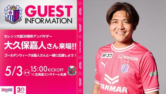 5/3(金・祝)札幌戦は30周年アンバサダーの大久保嘉人さんの来場が決定しましたのでお知らせします。試合当日はスタジアム場外のWAKUWAKUステージでのトークショーやキックインなどに参加予定です。