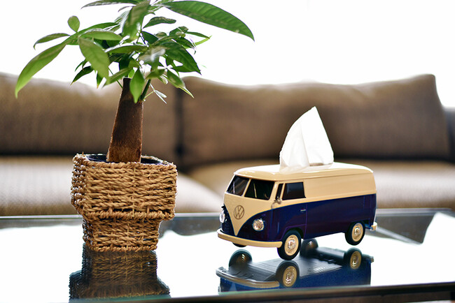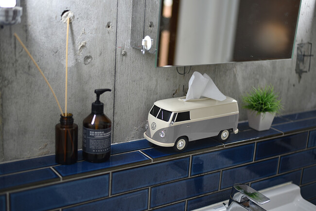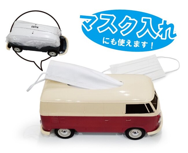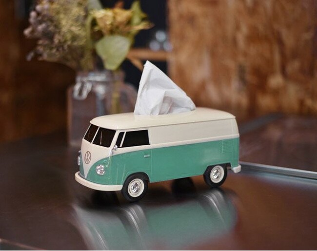 ノリモノの形の雑貨 CAMSHOPで、Volkswagenのクラシックバスの形をしたティッシュケースに新色のリミテッドグリーンが登場。