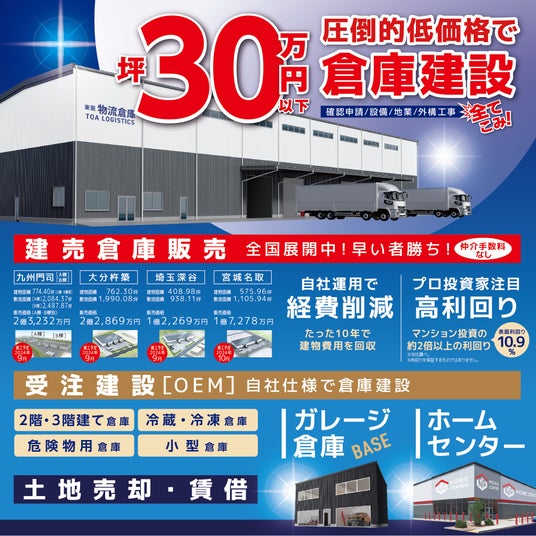 日本全国で「倉庫建設プロジェクト」を進めている株式会社東亜産業は、9月11日(水)から13日(金)までインテックス大阪で開催される「第8回 JAPAN BUILD OSAKA」にこの度、出展いたします。坪30万円以下(確認申請、設備、地業、外構工事)全て込みの圧倒的低価格で購入できる東亜の倉庫。購入後のアフターケアとして30年間の建物保証もいたします。会場では今すぐ買える倉庫の情報から開発中、開発予定の倉庫まで、全国で展開している倉庫プロジェクトの全貌を知ることができます。