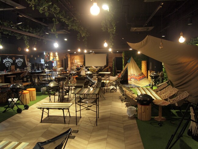 店内は室内にも関わらず、たくさんの緑があり、テント、ハンモック、BBQグリルと、本格的なキャンプ感を楽しめる空間になっております。