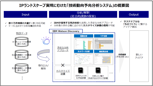 日本ゼオン株式会社(本社:東京都千代田区、代表取締役社長:田中公章、以下 日本ゼオン)と、日本アイ・ビー・エム株式会社(本社:東京都中央区、代表取締役社長:山口明夫、以下 日本IBM)は、日本ゼオンが持続可能な社会に貢献し続けることへの実現に向け、特許などの知的財産分析を経営判断に活かしていくために、本年12月からAIを活用した「技術動向予兆分析システム」の稼働を開始したと発表しました。本システムは、IBMのAIであり、複合的な検索・テキスト分析のプラットフォームであるIBM(R) Watson(R) Discovery(※1)を活用しています。日本ゼオンでは、本システムを活用し、10万件以上の大規模で複雑な特許データを効率よく網羅的に解析することで、移り変わる市場や需要、技術トレンドの予兆を的確かつ迅速に捉え、持続可能な社会に貢献し続けるための「ものづくり」に繋がるアイデアを導き出すことが可能になります。