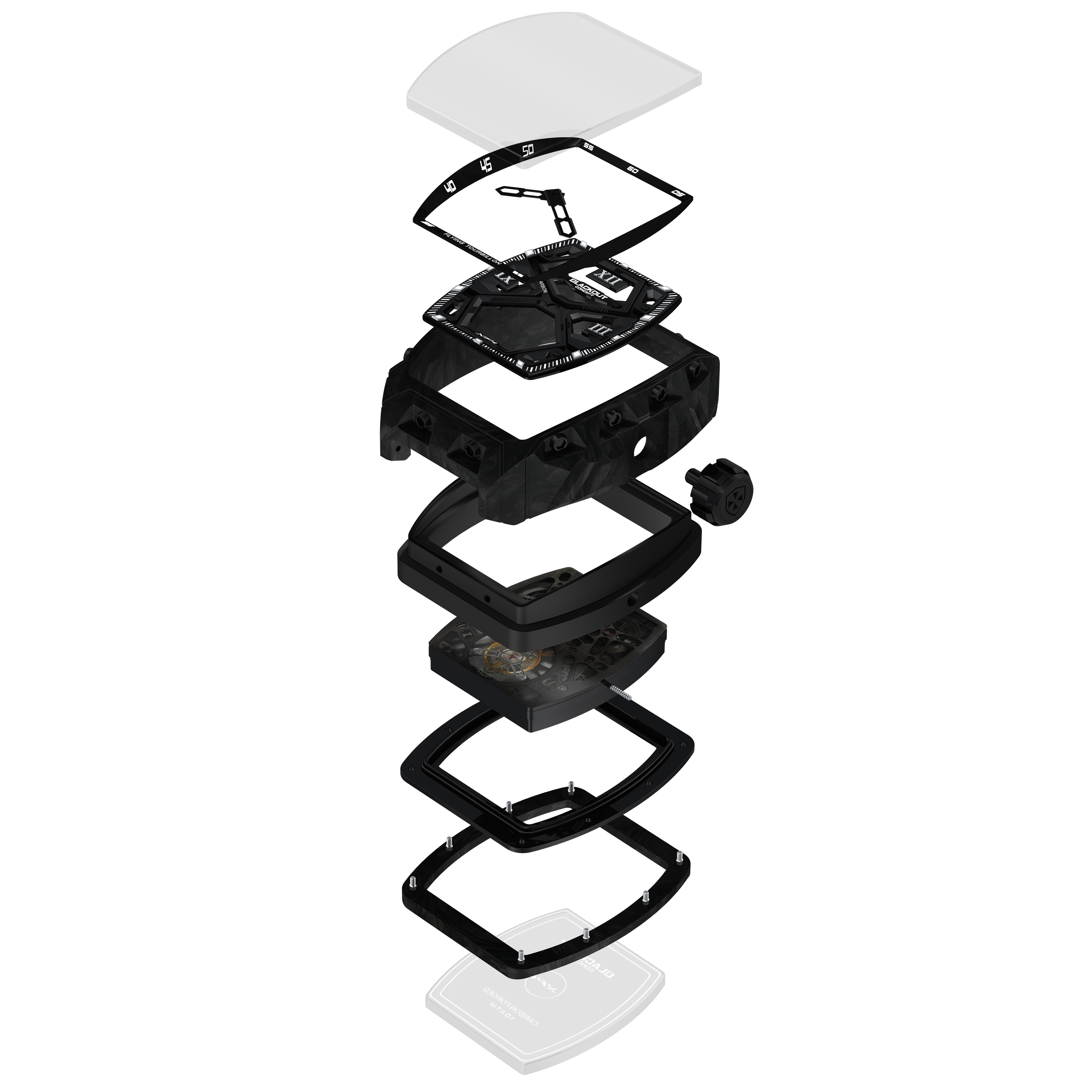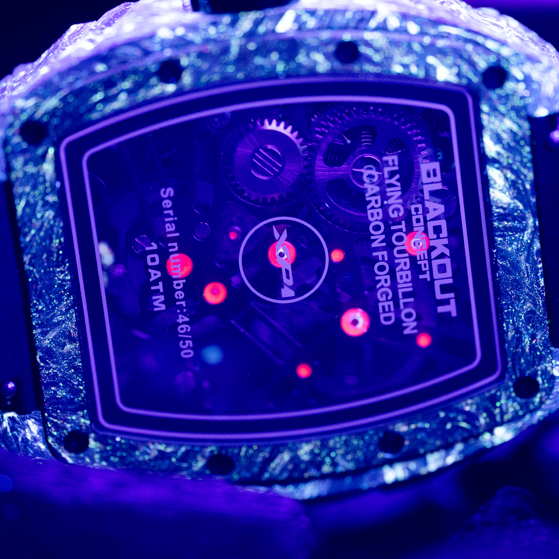 旗艦モデルの一つである「XP1 Tourbillon LT (Luminescent Tourbillon)」の 軽量かつ強度の高いカーボンケースは、鍛造工程でルミノバパウダーを組み込むことで、暗闇で光るユニークなデザインとなっています。