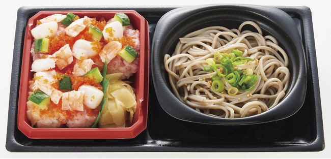 「まぐろすきみ」や「粗挽きサーモン」、「寿司えび」、「小柱」などを溢れるように盛り付けたにぎり寿司と、そばを一緒に楽しめる商品です。