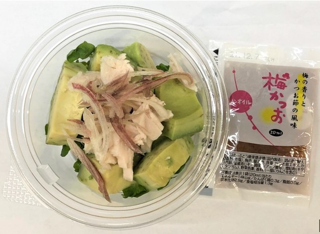 濃厚でクリーミーなアボカドの旨みと、みょうが特有の風味が特徴の商品です。トッピングにやさしい塩味をつけた「みつせ鶏」のフレークを盛り込みました。程よい酸味の「梅かつおドレッシング」をかけ、アボカドが崩れないように“やさしく”振ることで全ての食材のハーモニーが楽しめます。