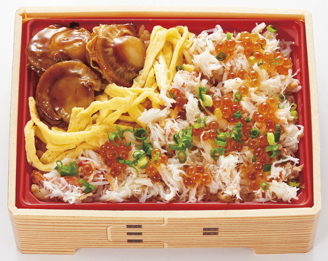 蟹の煮汁と醤油で味付けた茶飯に、店内で焼き上げた帆立照焼や、本ずわい蟹のほぐし身、いくら等を盛り付けた、蟹がお好きの方にはたまらない商品です。