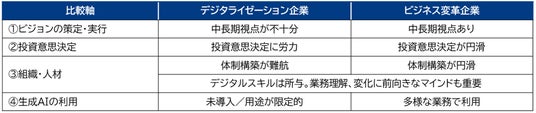 - 経営の柔軟性:デジタライゼーション企業は、オペレーションに制約を抱え環境変化に迅速な対応ができていないが、ビジネス変革企業は、柔軟な体制を整え変化に即座に対応。また、経営戦略とDX計画・取り組みが、内容・指標の両面で連動している。