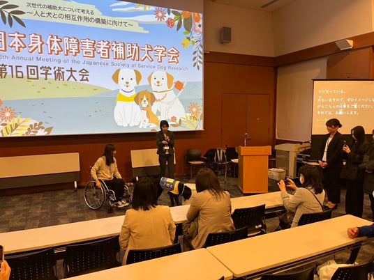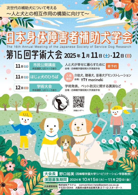 2025年1月11日(土)、12日(日)に四条畷学園短期大学にて日本身体障害者補助犬学会第16回学術大会(主催:一般社団法人 日本身体障害者補助犬学会)が開催された。身体障害者補助犬(補助犬)とは、「盲導犬・介助犬・聴導犬」の総称である。本学会は毎年補助犬の学術的発展のために開催されており、今年は「次世代の補助犬について考える~人と犬との相互作用の構築に向けて~」をテーマとし、四条畷学園短期大学(大阪府大東市)にて様々なシンポジウムや演題発表、教育講演が行われた。