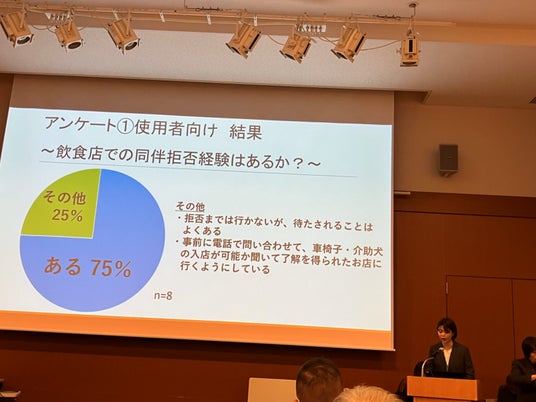 (社福)日本介助犬協会(以下、協会)からは2名の職員が一般演題発表を行い、補助犬同伴受け入れに関する調査や、協会のパピー育成プログラムについて報告されした。その他にも協会理事長高柳が座長を務めるペット防災に関する教育講演や、海外の取り組みを学ぶ国際シンポジウム等、幅広く企画され、参加者は補助犬がどのように当事者や社会に必要とされ、その効果を十分に発揮できるか考え直す機会となった。