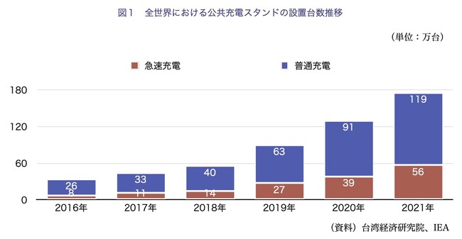 国際エネルギー機関(IEA)の統計によると、2019年時点における全世界のEV充電スタンドは650万台で個人所有のEV充電スタンドがかなりの割合を占めた。現在、世界各国で公共の充電スタンド建設が進んでおり、21年時点における全世界の公共急速充電スタンドが56万4000台、普通充電型が119万台にまで増えている。