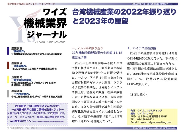 ワイズコンサルティング グループ(本社:中華民国台北市、代表取締役:吉本康志)は台湾機械業界専門誌「ワイズ機械業界ジャーナル」の2023年5月第2週号を発行しました。今週号では機械業界、半導体業界、電気自動車業界、工作機械の動向を紹介します。