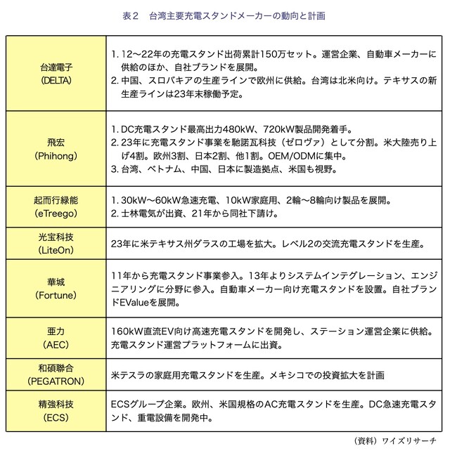 台湾の関連メーカーは電源、重電、情報通信関連企業が多く、その技術を活かして充電スタンド関連製品を生産している。中でも台達電子工業(デルタ・エレクトロニクス)と飛宏科技(PHIHONG TECHNOLOGY)は欧米の急速充電市場でけん引役となっており、ソフト・ハード両面そろったトータルソリューションを提供している。