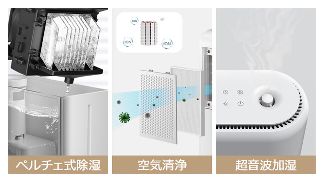「Makuake(マクアケ)」にて目標金額866万円を達成したVN-HD012除加湿空気清浄機は、除湿、加湿、空気清浄機能を1台に集約し、部屋の状況を自動で見張り、運転を自動でコントロールすることにより、「24時間、365日」快適な空気環境を提供します。