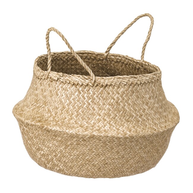 手編みの多機能なバスケットが、天然素材ならではのナチュラルな表情をプラスします。持ち手を出して収納物を目隠しすることも、内側に折り込んで収納物をディスプレイすることもできます。