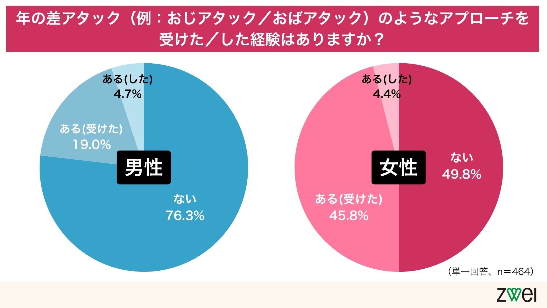 アプローチを「受けた」経験には大きな男女差があり、女性45.8%に対し男性は19.0%と2倍以上の開きがありました。女性の半数近くが年上からのアプローチを経験している一方、男性は2割程度に留まっています。
