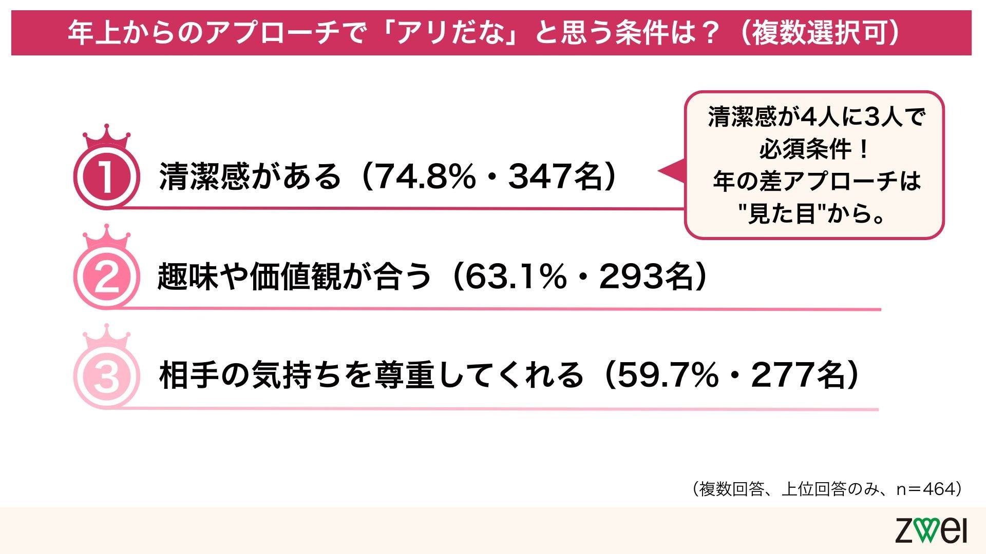 年上からのアプローチで好印象を持てる条件として、以下の3つが上位となりました。