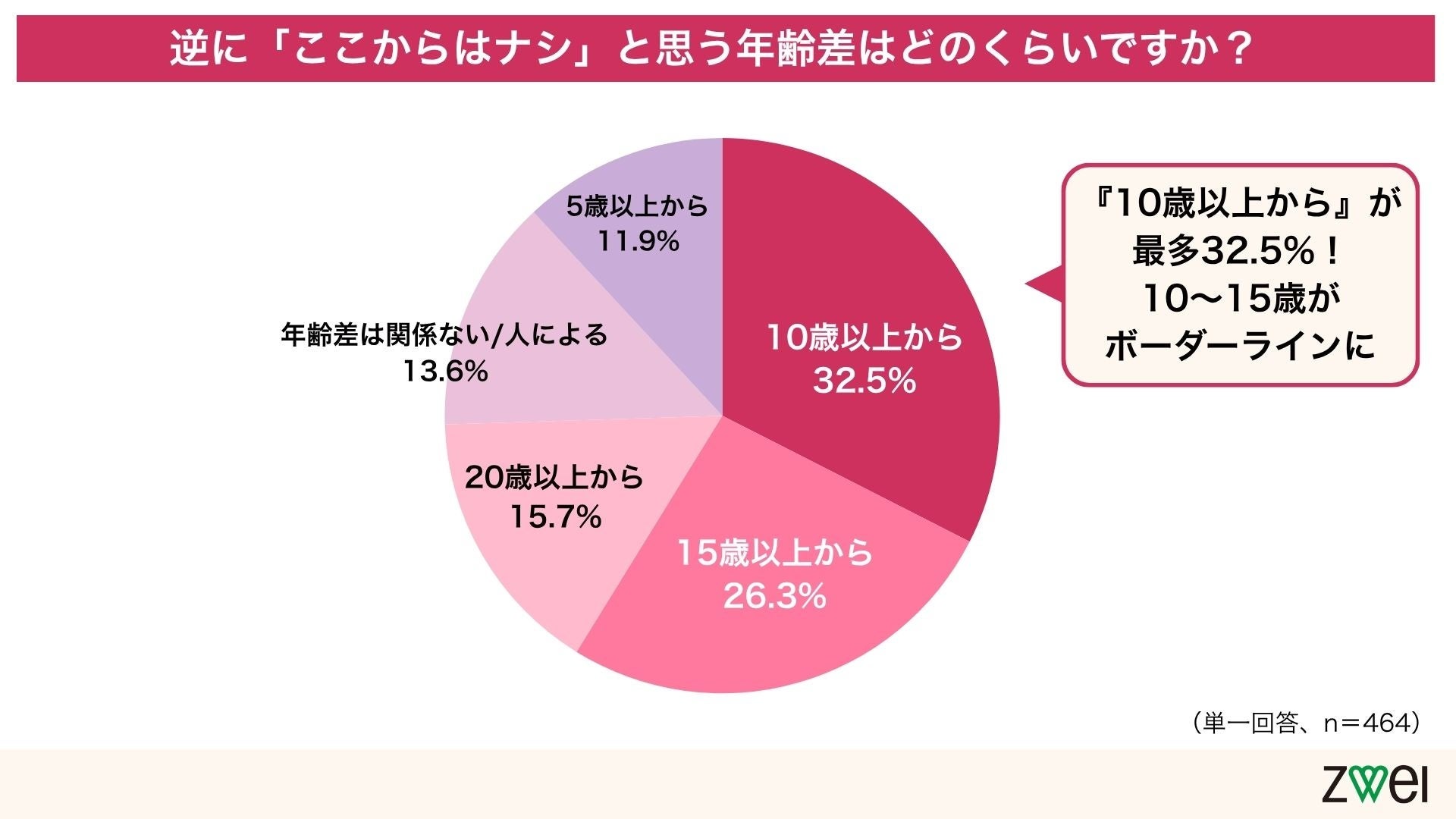 逆に「ここからはナシ」と思う年齢差については、「10歳以上から」が32.5%で最多、「15歳以上から」が26.3%で続き、合わせて約6割となりました。