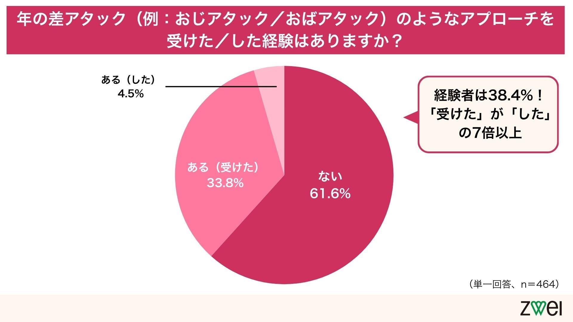 「年の差アタック」の経験がある人は38.4%。特に「アプローチを受けた」経験者が33.8%(157名)と多く、実際の恋愛・婚活の場で年の差アプローチは珍しくないことが分かりました。