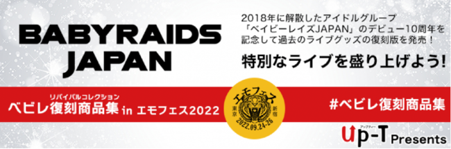 丸井織物株式会社(本社:石川県鹿島郡、代表取締役社長:宮本 好雄、以下:丸井織物)が運営するオリジナルTシャツ制作サービス「Up-T」は、2022年9月24日から9月26日まで開催されるライブイベント「エモフェス」とコラボレーションし、「ベイビーレイズJAPAN」ライブグッズの復刻商品を販売します。