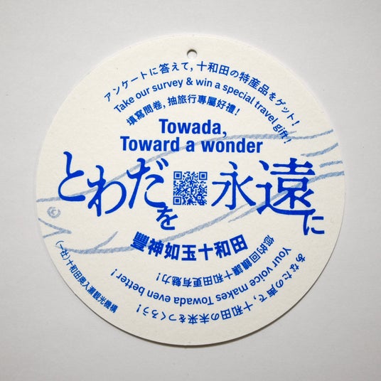 コースターの裏面には、「あなたの声で、十和田の未来をつくろう!」、「とわだを永遠に」と、アンケート協力を促す文言を記載して、アンケートに答える来訪者の方も将来の十和田市を作っていく一員であることをアピールしております。中国語や英語でのメッセージも併せて記載することで、国内だけでなく海外からの来訪者にもアンケートに関心をお持ちいただけるようにしております。