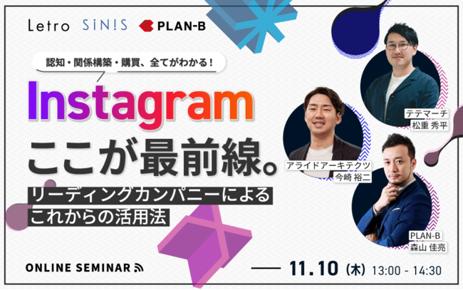 今回のセミナーでは「Instagram、ここが最前線。」と題し、Instagramマーケティングをけん引するテテマーチ、アライドアーキテクツ、PLAN-Bが「これからのInstagramの活用方法」や「UGC2.0」、「最新アルゴリズム」についてご紹介いたします。