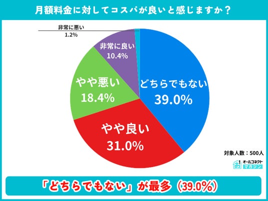 月額料金に対するコストパフォーマンスを聞いたところ、「どちらでもない」が39.0%で最多でした。「やや悪い」18.4%と「非常に悪い」1.2%で、合計19.6%がコスパに不満を感じています。