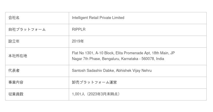 双日株式会社(以下「双日」)は、このたび、インドのスタートアップ企業であるIntelligent Retail Private Limited(インテリジェント リテイル プライベート リミテッド)(以下「RIPPLR(リップラー)」)による第三者割当増資に参画、出資しました。今回の出資は、2021年12月の出資に続く追加出資で、双日は、RIPPLRへの事業支援を通じて、成長を続けるインドにおける流通業界への貢献を加速させます。
