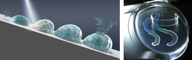 図 新種洞窟細菌HS-3の多細胞性ライフサイクルの予想図(左)と液晶状コロニーの写真(右)