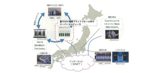 また、日本を代表するスーパーコンピュータ「富岳」※2をはじめとする複数のスーパーコンピュータと、IBM社製の超伝導型量子コンピュータ「IBM Quantum System Two」※3やQuantinuum社製のイオントラップ型量子コンピュータ「黎明」※4などを、高速ネットワークで密に連携させ、ポスト5G時代のネットワークで提供されるサービスとして展開するための技術開発を推進するものでもあります。