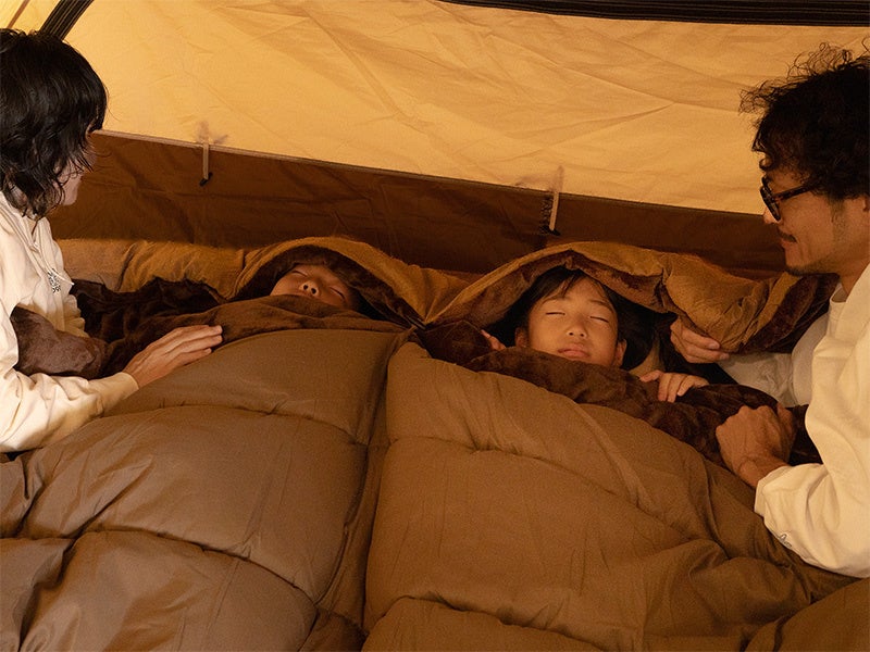 幅230cmの圧倒的な広さにより家族4人が川の字に並んで入ることが可能。1人で寝袋を使うのが難しい小さなお子さまとも添い寝ができ、家族の体熱で寝袋のスペック以上に暖かく眠れます。