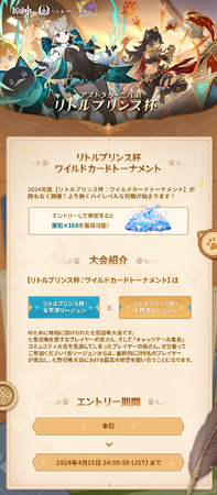 また、キャッツテール集会に参加できなかった方にとって、ワイルドカードトーナメントは本シーズンのリトルプリンス杯に参加できる最後のチャンスとなります。大西洋リージョンのワイルドカードトーナメントは4月26日(金)から28日(日)まで、太平洋リージョンは5月17日(金)から19日(日)まで開催されます。第一試合を終えた全ての参加者には原石160個が与えられ、さらにBO3初戦に勝利した選手には、ゲーム内で使用できる限定カード裏面が報酬として贈られます。