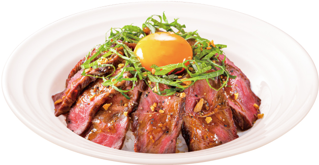 塊のまま焼き上げた柔らかい肉質が特長の希少部位みすじを、食べやすいサイズにスライスしてライスが見えなくなるほどたっぷりトッピングしました。みすじはオーブンでじっくりと焼くことで、赤身の旨みを感じられるように仕上げました。醤油ベースの特製ステーキソースと一緒にお召し上がりください。