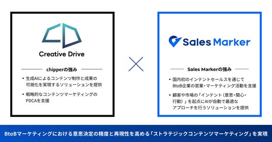 国内初※1「顧客起点」で営業やマーケティング活動を戦略的に自動化する新しい成長モデル「インテントマーケティング」を実現する『Marketing Marker(マーケティングマーカー)』を開発・提供する株式会社Sales Marker(本社:東京都渋谷区、代表取締役 CEO:小笠原 羽恭、以下:当社)は、記事コンテンツの効果を"見える化"するマーケティングツール「Creative Drive」を展開する株式会社chipper(本社:東京都品川区、代表取締役:十時悠径、以下:chipper)との業務提携を開始したことをお知らせします。