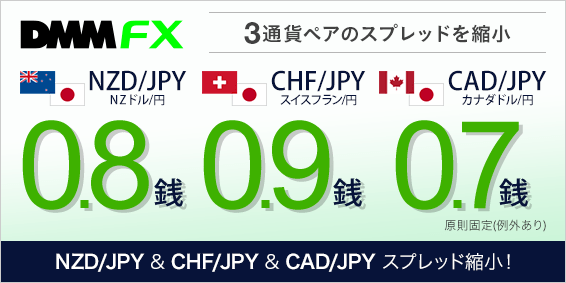 株式会社DMM.com証券(本社:東京都中央区、代表取締役 谷川龍二)が提供する【DMM FX】において、2023年6月1日(木)06時00分より「NZD/JPY(ニュージーランドドル/円)」「CHF/JPY(スイスフラン/円)」「CAD/JPY(カナダドル/円)」の基準スプレッドを縮小いたしましたので、ご報告いたします。