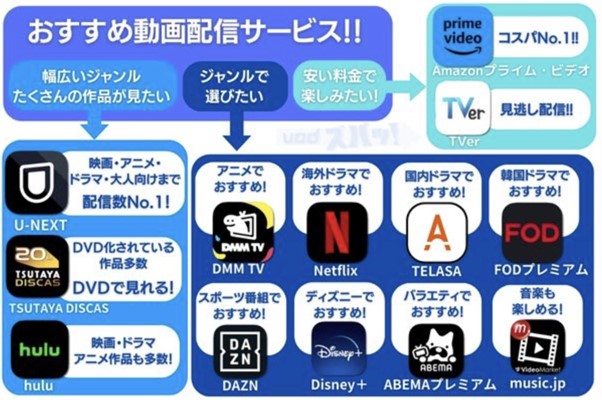 アニメや映画、ドラマなどの動画作品が、スマートフォンやテレビのアプリでいつでも好きな時に視聴できる、月額定額制の動画配信サービスは現在人気が高く、サービスも数多くあります。