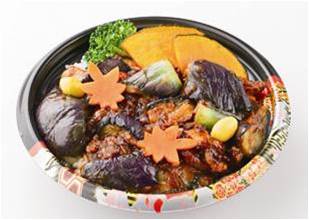 秋の野菜、茄子と豚肉を甜麺醤で甘味噌味に仕上げた丼です。