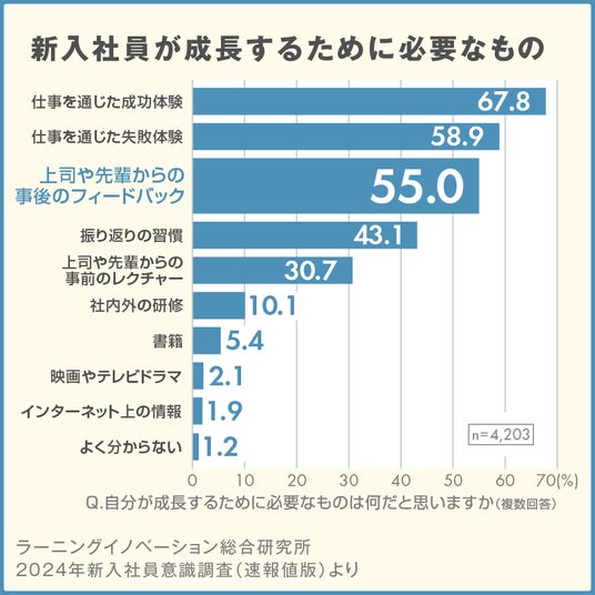 当社が実施した新入社員意識調査*1によると、自身が成長するために「上司や先輩からの事後のフィードバック」が必要だと回答した新入社員が半数以上いる結果となりました。
