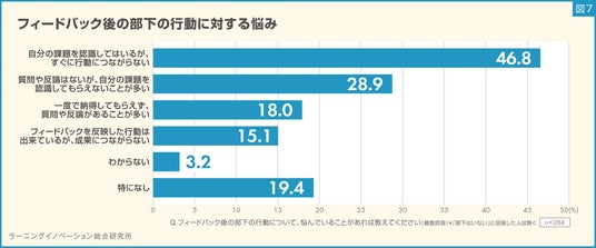 フィードバック後の部下の行動について、悩んでいることを質問したところ、「自分の課題を認識してはいるが、すぐに行動につながらない」と回答した割合が46.8%となりました。次に、「質問や反論はないが、自分の課題を認識してもらえないことが多い」と回答した割合が28.9%と続きました。(図7)