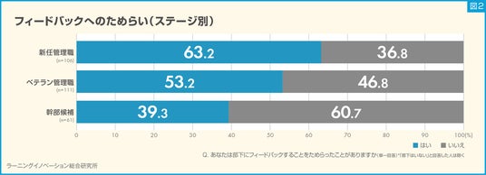 部下へフィードバックする際、ためらったことがあるかステージ別に比較しました。「はい」と回答した割合は、新任管理職は63.2%、ベテラン管理職は53.2%、幹部候補は39.3%となりました。ステージが低い管理職ほど、フィードバックをためらう傾向にあることが明らかとなりました。(図2)