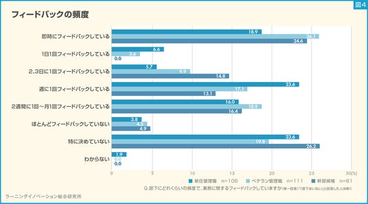 新任管理職は「週に1回フィードバックしている」「特に決めていない」がともに23.6%となりました。ベテラン管理職は、「即時にフィードバックしている」が26.1%、次に「特に決めていない」が19.8%。幹部候補は「特に決めていない」が26.2%、「即時にフィードバックしている」が24.6%となりました。(図4)